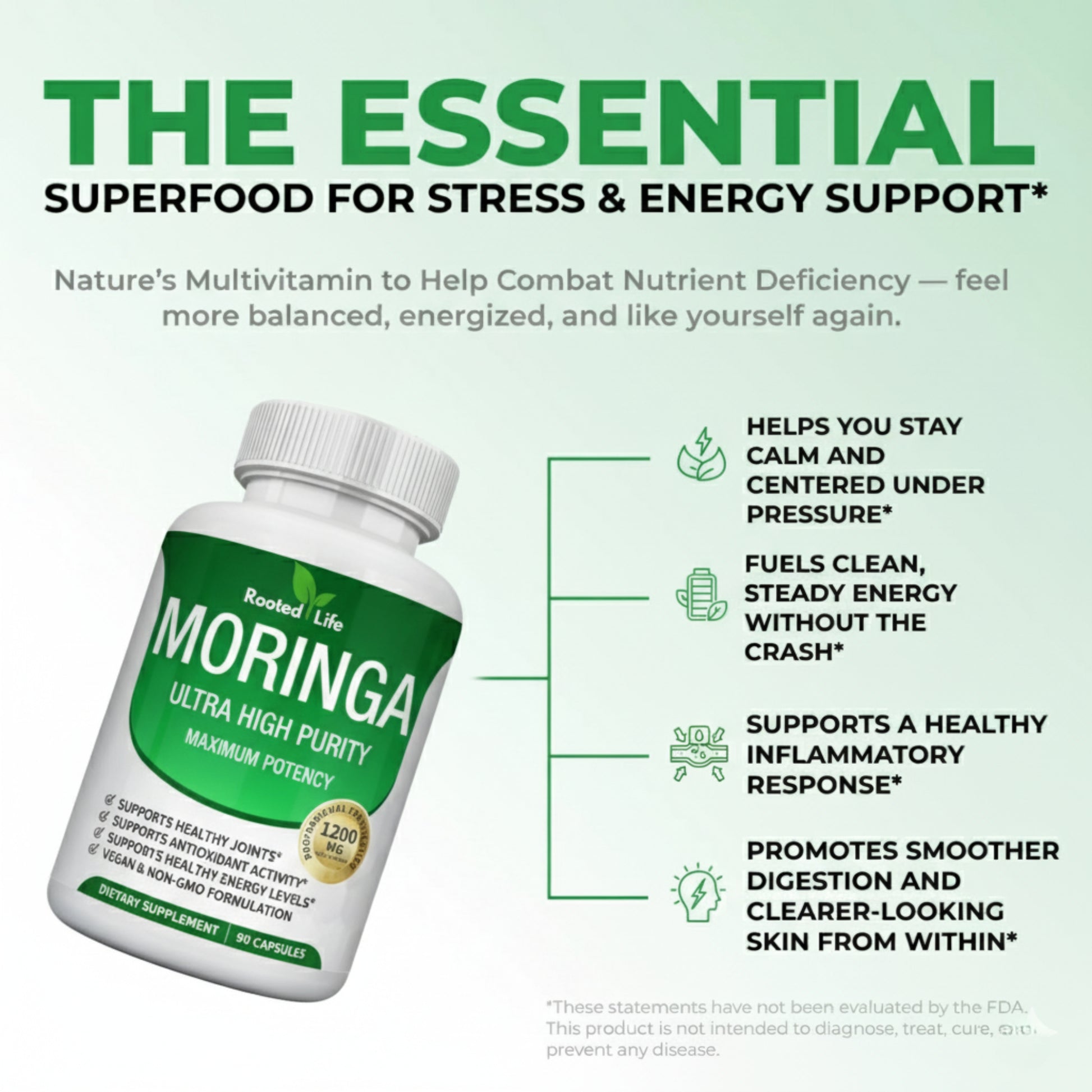 Rooted Life Moringa is formulated with natural ingredients and is generally safe for most individuals. If you have specific health concerns or are currently taking medication, however, we strongly recommend consulting with a healthcare professional before adding any new supplement to your routine.