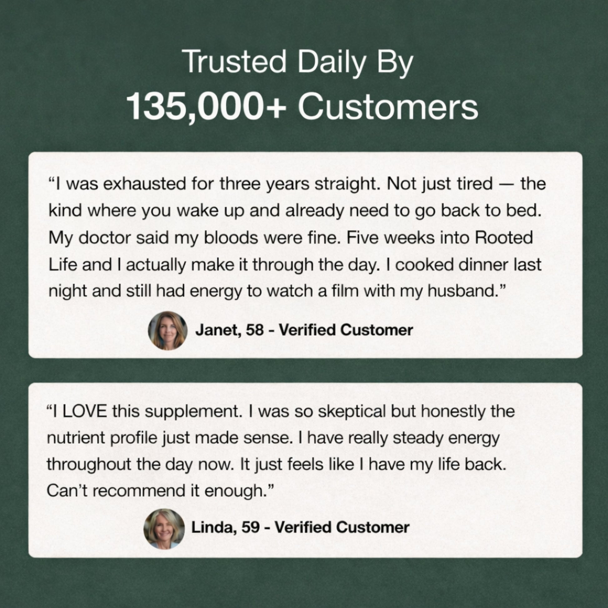 I'd been exhausted for three years. Not tired — exhausted. The kind where you wake up and already need a nap. My GP said my bloods were fine. Four weeks on Rooted Life and I actually have energy past 2pm. I'd forgotten what that felt like.